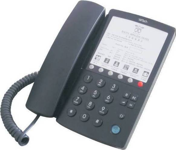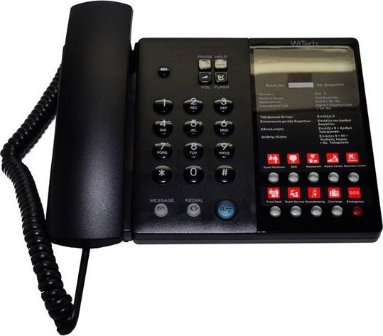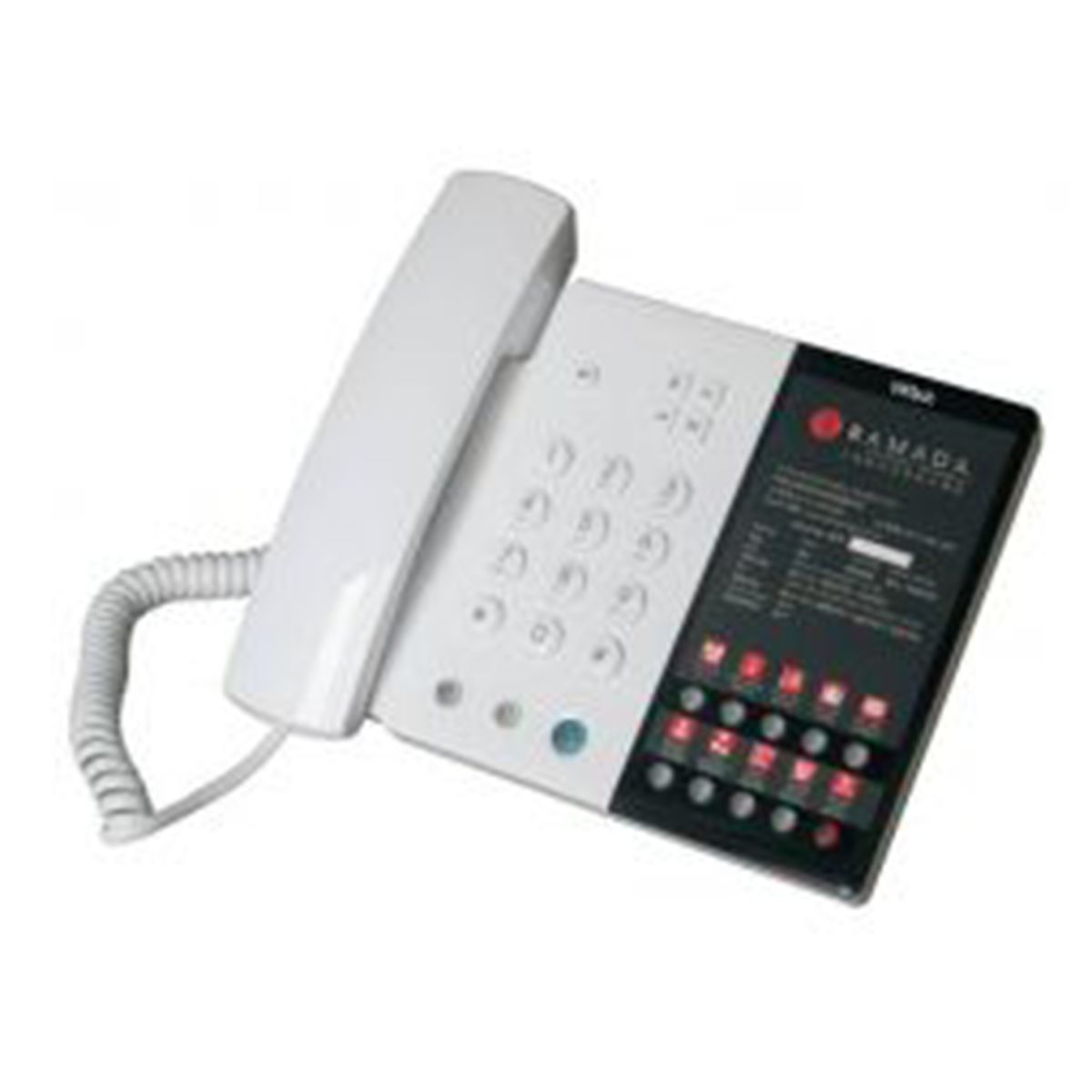 Απλή ενσύρματη ξενοδοχειακή τηλεφωνική συσκευή, • 5 Πλήκτρα υπηρεσιών φιλοξενίας του ξενοδοχείου άμεσης κλήσης, • 1 Κόκκινο Πλήκτρο Emergency (SOS), • Ανοικτή συνομιλία, • Πλήκτρα Redial, Flash για μεταβιβάσεις, Hold, Pause, • Λυχνία ένδειξης εισερχόμενης κλήσης και Μηνύματος στην Αναμονή (Message Waiting), • Ρύθμιση έντασης κουδουνισμού (High/Low) • Ειδική βάση για ενίσχυση της γωνίας ανάκλισης στη συσκευή, • Επιτραπέζια τοποθέτηση.